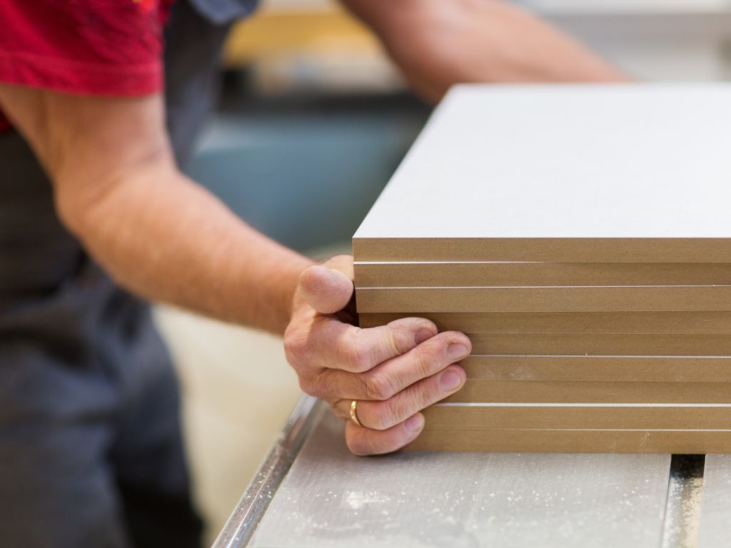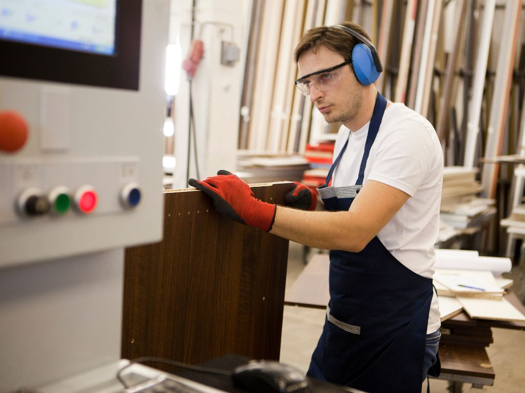 Precyzyjne urządzenie przemysłowe do produkcji mebli z drewna, w fabryce mebli TOMIX MEBLE, pokazujące nowoczesne technologie obróbki drewna.